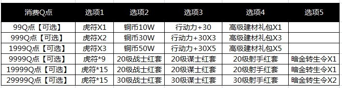 2.活动奖励是累积领取的,比如消费满999Q点的主公就能领取1、2两个档次的奖励。