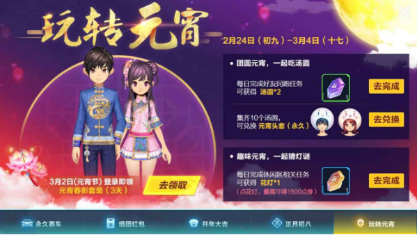 玩转元宵,2月24日到3月4日期间,玩家可以参与元宵活动。在3月2日当天登陆就可以领取元宵春影套装3天,并且还有永久的元宵头套可以获得。每日完成好友同跑任务,还有汤圆可以获得。