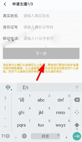2、输入姓名、身份证号、移动电话,点击“下一步”,如下图: