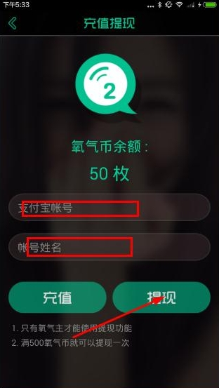 2、在这里输入支付宝账号和账号姓名,点击提现就可以的哟~温馨提示:只有氧气主才可以提现的哟,满500氧气币才可以提现的哟~