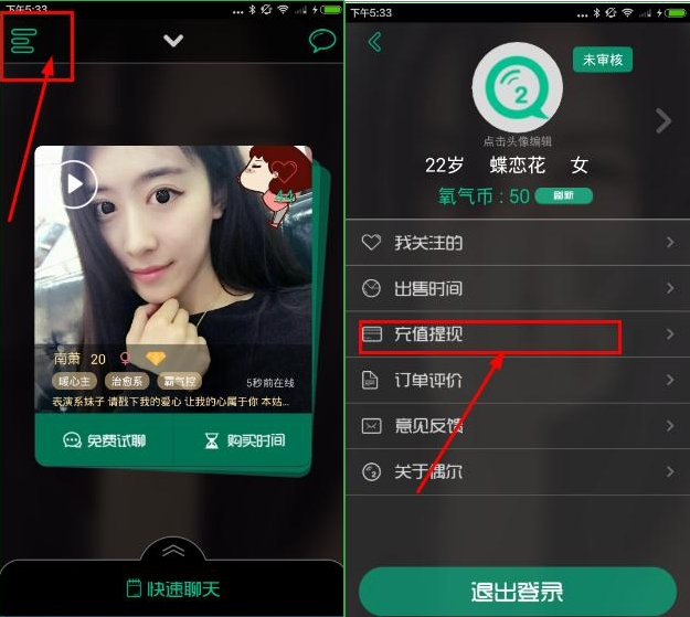 1、打开偶尔首页,点击左上角的图标,进入个人中心,点击充值提现;