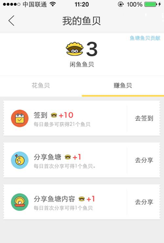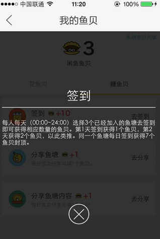 1、签到,每人每天选择3个已经加入的鱼塘去签到,即可获得相应数量的鱼贝。第一天签到获得一个鱼贝,第二天获得两个鱼贝,以此类推。同一个鱼塘每日签到获得七个鱼贝封顶;