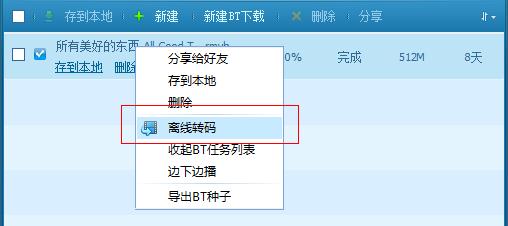 1. 登录离线下载,在已经完成的任务上点击鼠标右键,选择“离线转码”,在新弹出的对话框上点击“确定”,就可以进入离线转码过程(注意哦,这个任务是“秒转”的,非常神速呢)