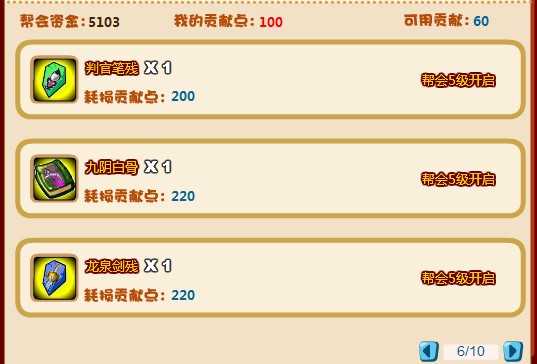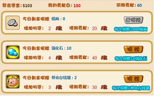 玩家可以捐赠银两、强化石和存钱罐到帮会,在为帮会增加物资的同时,也为自己增加一定的贡献值