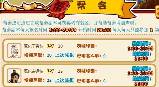 每天的凌晨1:00——晚上20:00是帮会副本报名时间,晚上21:00帮会副本开启。完成帮会副本将给帮会带来巨大的声望收益。同时,参与副本的所有人都有机会获得副本掉落的装备或道具。但是每人每天只能报名1场帮会副本哦。