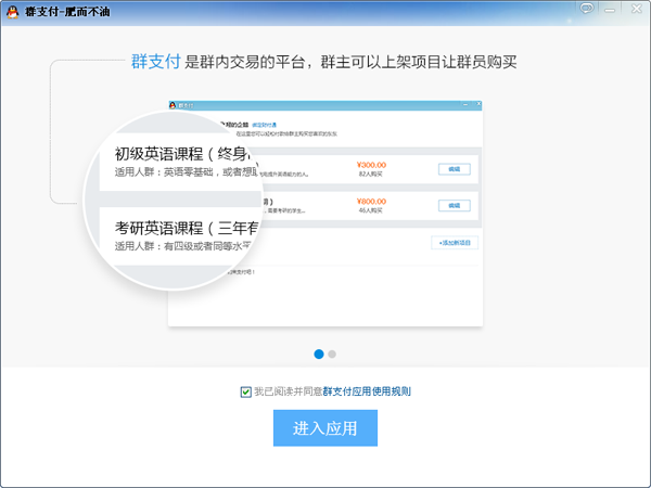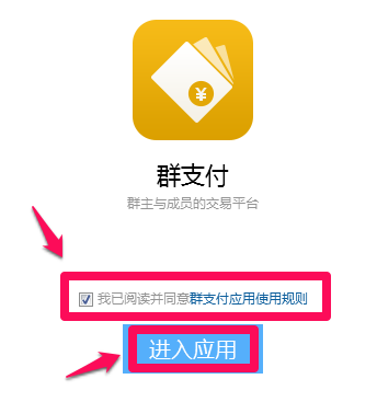 2、进入以后同意群支付协议然后点击【进入应用】继续。