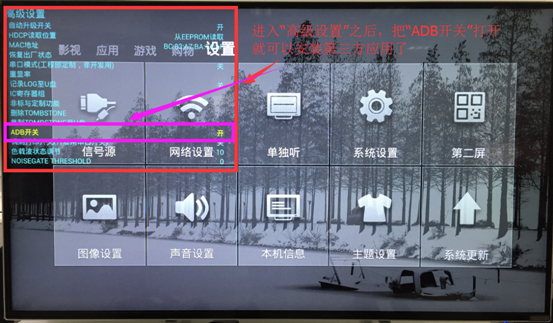 电视机型号:40K1Y、49K1Y、49K1C的工厂菜单的其它设置内有一项“Adbd Enable”,将后面的参数修改为1即可。