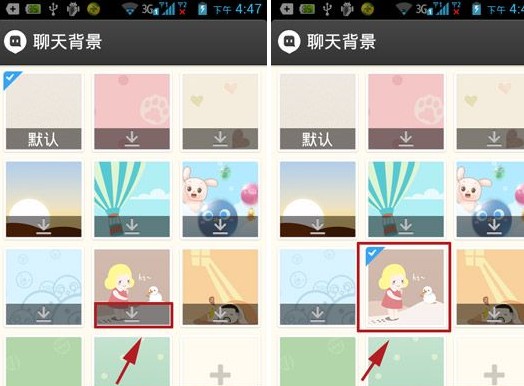 2、找到你喜欢的图案,然后点击图片下方的下载,下载完成后最后点击图案,那么陌陌上聊天背景就已经设置成功了。