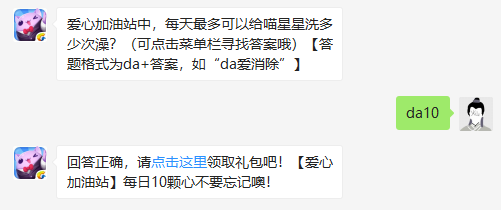 爱心加油站中,每天最多可以给喵星星洗多少次澡?(可点击菜单栏查找答案)【格式为da+答案,如“da爱消除”】在今天的天天爱消除的每日一题中有问到天天爱消除微信公众号的有关问题,很多玩家是不是还不知道呢?正确答案是da10哦,很多玩家是不是还不是特别了解呢,一起来看看天天爱消除手游微信爱心加油站中每天最多给喵星星洗多少次澡把。