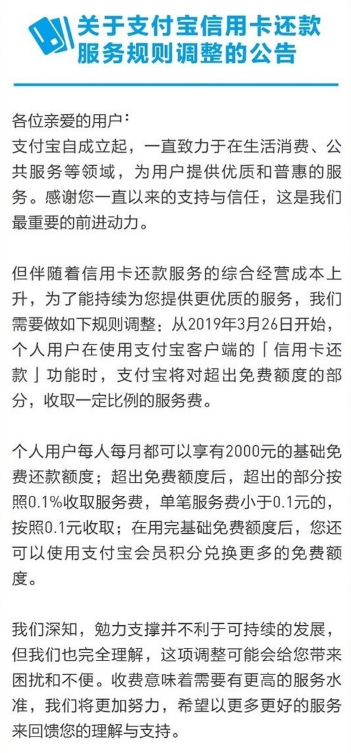 支付宝提供用户每月2000元的免费额度。也就是说,2000元以内依然免费,超出2000元的部分,再按照0.1%收取服务费。