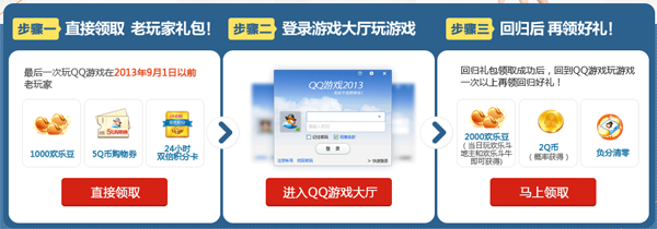 1、活动期间,最后一次玩QQ游戏在2013年9月1日以前老玩家,可直接在页面领取老玩家礼包一份。