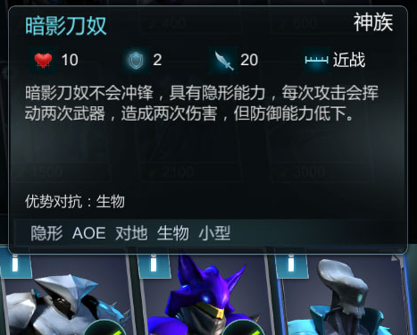 神族开局就可以出隐身兵种暗影刀奴,200灵蕴的兵种,攻击力20,并且有挥砍两下的双刀被动,初期输出非常优秀,配合灵鹫制空击破反隐单位后,毫不讲道理的屠杀,缺陷是血量太低,面对AOE单位没反隐都会溅射全灭,但这不碍事,你出1个暗影刀奴,对方就要出一个600灵蕴的反隐,气势上就赢了,还可以转换成侍卫,作为远程输出;