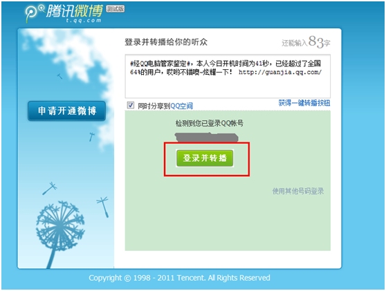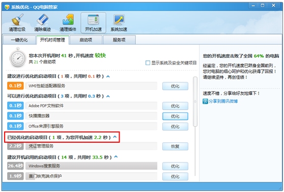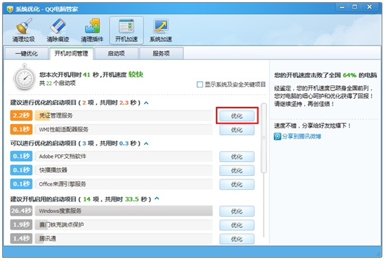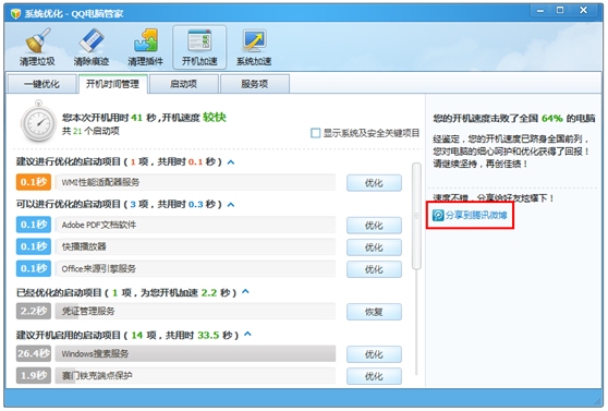 (3)优化完了,您可以试试将开机时间分享到微博。