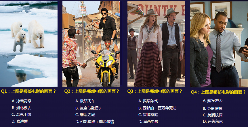 2、活动期间看图猜片名,答对1题可获得1次抽奖资格;答对2-3道题可获得2次抽奖资格;全部答对可获得3次抽奖资格,100%中奖;