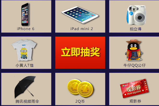 活动奖品:Q币、观影券、iPhone、iPad mini、拍立得等
