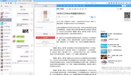 4、在展示上,微信窗口以侧边栏形式出现在浏览器左侧,点击联系人及公众账号,聊天窗口向右侧层层展开,而点击文章链接,文章将以链接形式在浏览器中打开,浏览器页面与微信聊天窗口可同步展示。