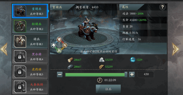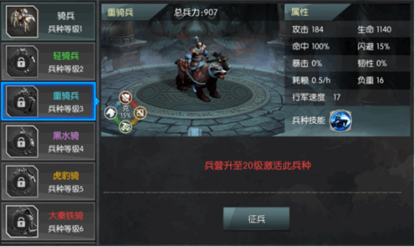 游戏中兵种共分为:步兵、弓兵、骑兵、器械4个种类,每个种类的兵种都有各自的特点:步兵生命值和攻击力都很高同时抗暴击能力强,可以作为主力输出;弓兵生命值和攻击力中等但命中率高,可以稳定输出;骑兵生命值和攻击力都较高同时拥有很高的闪避率,机动性较强;器械生命值高攻击力中等,但是拥有较高暴击,可以作为爆发性输出;