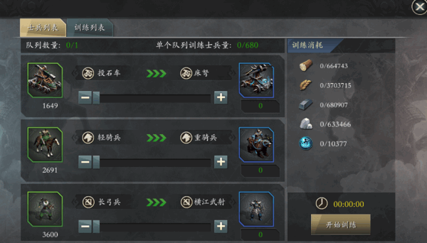 4种士兵都可以在兵营中招募,兵种等级越高,所需要的兵营等级也越高,兵种的招募时间和城池属性、校场等级、科技等级挂钩,部分高级兵种需要占领特定的城镇同时兵营达到一定等级才能招募;每个国都和王城都有特色兵种,国都和王城的拥有者可以训练该兵种。