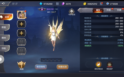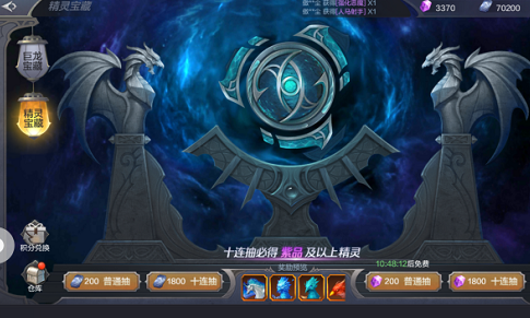 精灵宝藏:和巨龙宝藏是一样的,我们可以抽奖来获得我们的精灵,价格就是200钻石一次,抽十次是1800的钻石,有钻石还有粉钻抽奖的,钻石抽同样会获得积分,积分可以兑换我们的大天使武器。