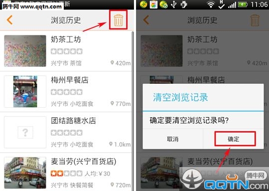 2)进入浏览历史界面后,点击“删除”按键,然后显示出的界面中按“确定”按键。这样手机大众点评浏览记录就删除成功了!(如下图所示)