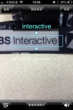 进入到该功能后,用户可以发现屏幕出现了取词框,将单词放置在取词框的上下箭头位置,即可进行识别,并在下方给出解释。经过我们的实际使用,有道词典的摄像头查词识别率较好,能够给用户带来很大的便捷性。不过需要注意是取词过程需要,取词最近距离需要大于5CM,另外距离较远单词也无法进行识别。