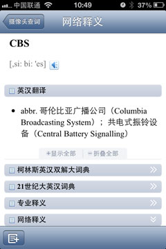 有道词典摄像头查词左下方为生词添加按钮,可将当前单词添加到生词本中,有助于日后的学习。中部位查看网络释义,该功能将引导用户查看当前单词的网络释义、专业释义、同根词、词组短语、同近义词、双语例句等信息,内容量包含非常丰富。右侧为发音按钮,点击后即可收听该单词的读音。