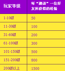 使用“邀请”功能成功向好友发送邀请的玩家,每成功发送1次就可以获得相应经验的奖励,玩家每天前10次 “邀请”会获得经验奖励,如果“邀请”次数超过10次,当天依旧可以“邀请”其他好友,但是无法继续获得经验。对应经验奖励如下: