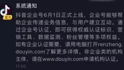 除此之外,6月1日前已经开通“企业认证”的用户也可通过帐号关联的方式快速获取抖音认证。