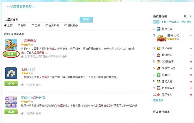 第一步:使用没有添加过《九品芝麻官》游戏的QQ号登陆QQ空间或者腾讯朋友添加《九品芝麻官》。
