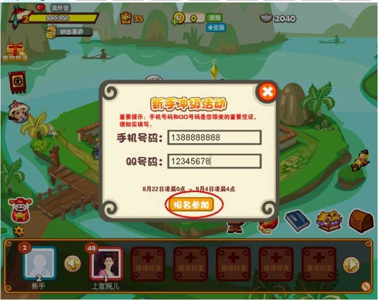 3、玩家报名后需要填写真实QQ号码和手机号码并确认,因玩家未填写上述信息或填写错误而导致奖品无法发放的,相关责任由玩家个人承担。