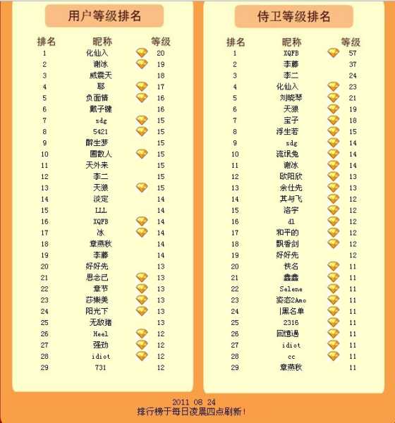 侍卫排行(黄钻玩家获得Q币奖励将额外增加+10%)