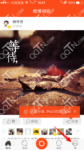 1、登录微博相机以后,在主页可以看到我,点击进入,如图: