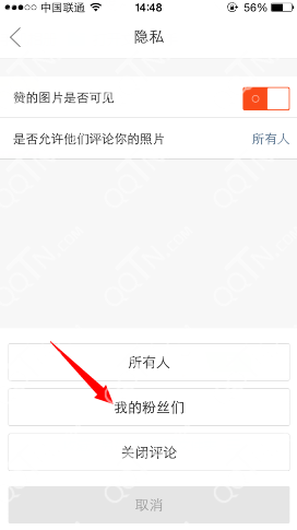 5、微博相机默认微所有人都可以评论你的照片,如果你只想粉丝评论你的照片,那就选择我的粉丝们即可。