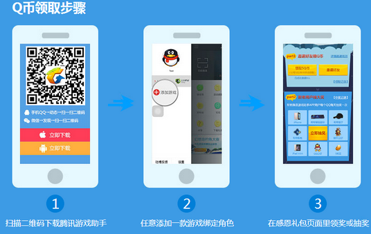 领取Q币的步骤也很,当你下载腾讯后,在游戏中绑定自己的角色,就可以在感恩礼包页面进行领奖了。Q币是每日20:00开放,先到先得哦!