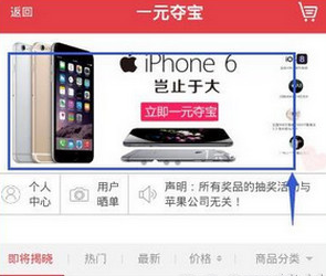 2、在一元夺宝页面中,点击立即夺宝进行支付1元,即会为你夺宝的商品分配对应数量的号码,而每个号码价值1个元;当一件商品所有号码售出后,根据预先制定的规则计算出一个幸运号码,持有该号码的用户,直接获得该商品。