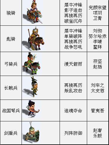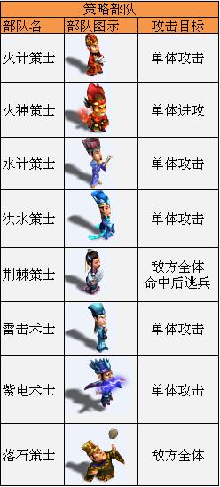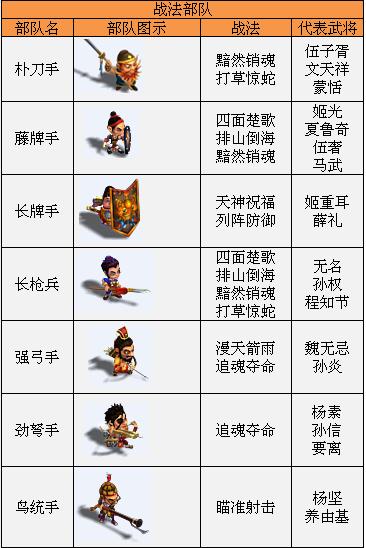 战法部队大都是以持武器的人形显示的,在士气到达100或以上时会释放战法,不到100时会释放普通攻击敌方单体。这里列举部分在游戏前期会遇到的战法部队,您可以事先认识一下他们。