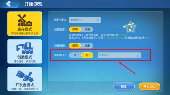地形选择选择随机,地图种子选择开,将地图特征码输入 ,确定生成,我们就能获得对应的地形啦。