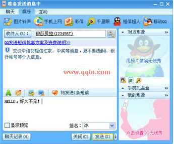 例如:要与QQ号为123456789的好友聊天,该好友的编号为109,可通过手机编辑聊天消息(如“你好”)发送到16109901109,好友即可在QQ上收到该聊天消息。