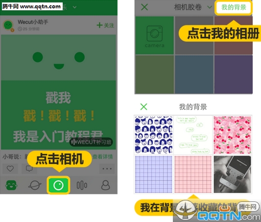 从下图可以看到,在wecut首页选择相机,然后就可以看到右侧我的背景图,如图: