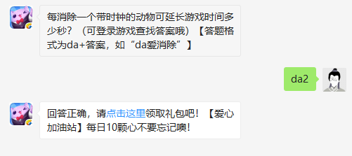 每消除一个带时钟的可延长游戏时间多少秒?(可登录游戏查找答案哦)【答题格式为da+答案,如“da爱消除”】在今天的天天爱消除的每日一题中有问到天天爱消除道具效果的有关问题,很多玩家是不是还不知道呢?正确答案是da2哦,玩家一般是可以通过消除带时钟的动物来延长自己2S的游戏时间,一起来看看天天爱消除手游道具效果的详细解读吧。
