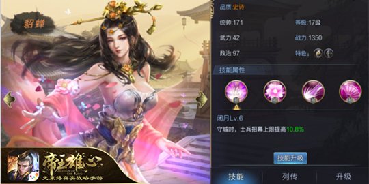 中国古代四大美女之一的貂蝉,民间传说中原名任红昌,为了报答义父王允的养育之恩而甘愿献身,离间吕布和董卓,完成连环计,成功诱使吕布诛杀董卓。所谓帷中敌国笑中刀,纤手能将贼命操;虽是司徒施巧计,论功首属女英豪。《帝王雄心》手游中貂蝉四个技能都为被动技能,且都是守城时才可触发效果的增益技能。所以当主公在外征战四方时,不妨让貂蝉为你守城稳固后方。