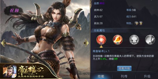 三国中有孙夫人这种才智敏捷,刚强勇猛,连入洞房都有带刀侍女在旁的女汉子,但真正上过战场的女武将却只有这一位祝融夫人。她是南蛮王孟获之妻、祝融氏之后。善使飞刀,百发百中。曾替夫出阵,以飞刀伤张嶷之手,又擒马忠。《帝王雄心》手游中的祝融夫人也是位英勇善战的女武将,她的技能主要用于强化驯兽师和藤甲兵的战斗力,如果主公手中恰巧这两个兵种数量较多,带上祝融夫人,将会如虎添翼。