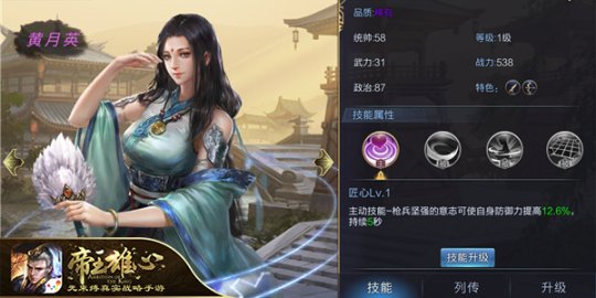 诸葛亮之妻——黄月英,名士黄承彦之女。自幼熟读经史,多才多艺,上通天文,下察地理,文韬武略,足智多谋。据传诸葛亮发明木牛流马,是从黄月英传授的技巧上发展出来的。史称其长相丑陋,黄头发,黑皮肤,不过在黄月英的家乡湖北襄阳,当地人为这位才女修建的庙宇里,她可一点也不难看。《帝王雄心》手游里的黄月英相貌姣好,其技能主要为加强枪兵和弓兵的战斗力。二技能机巧效果为守城时,增加枪兵和弓兵攻击力,搭配貂蝉守城效果极佳。