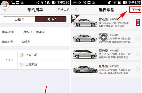 2、进入预约用车界面选择【一号专车】输入相关信息后点击下一步,接着选择车型,勾选后点击【下一步】。