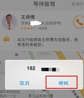 点开号码图标之后,我们可以看到屏幕中出现了一个号码,这就是接单师傅的电话,大家选择下方的呼叫按钮即可就可以于司机取得联系。