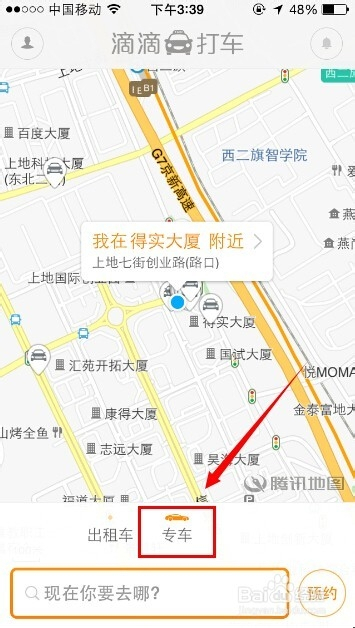 1、首先我们打开手机中的滴滴打车最新版可以发现里面已经内嵌了滴滴专车APP,然后在主界面中出现了我们当前的位置以及周围的地图,大家选择下方的【专车】选项。