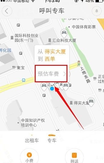 2、点击完毕,就来到了预估费用的界面,在界面中可以看到滴滴专车为我们预估的费用是多少,下方还有显示预计里程等。