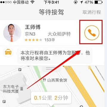 如果有司机成功接单,我们可以看到在界面的上方会出现关于司机的资料,大家可以选择右边的号码图标进行联系。