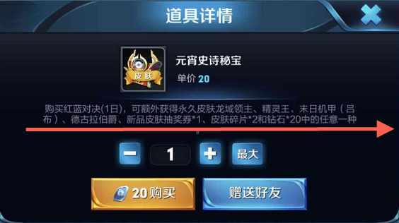 元宵史诗秘宝可以开出的奖励有:必得红蓝对决一天,有机会额外获得永久皮肤龙域领主,后羿精灵王,吕布末日机甲,以及刘邦的德古拉伯爵皮肤。