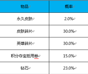 想要2块钱开到永久的末日机甲,几率是很低的,以上是官方给出的具体几率数值,可以看到抽永久皮肤的几率是2%。
